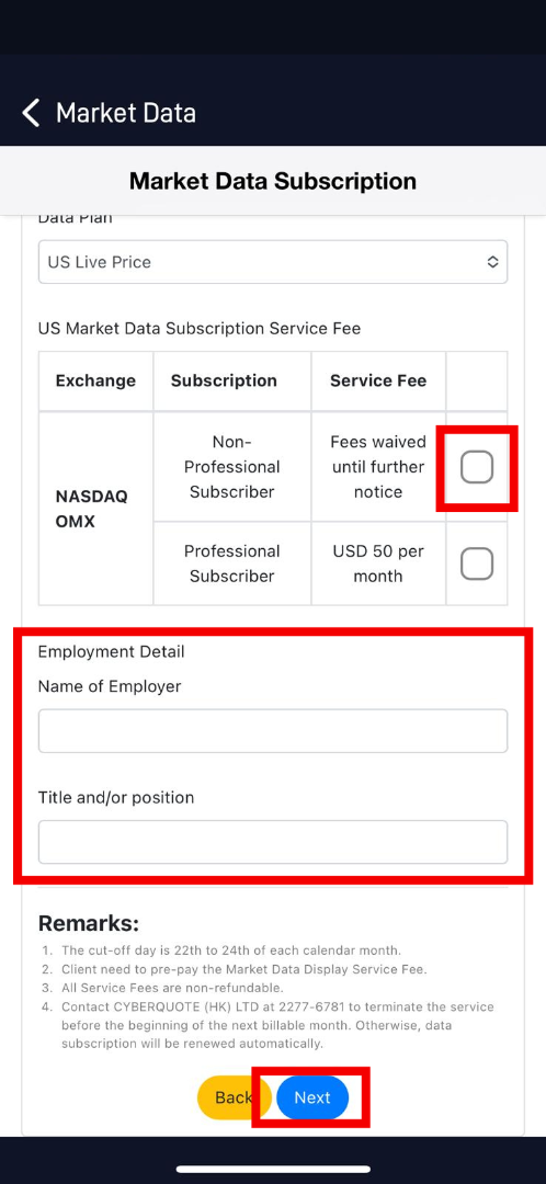 1. Login to POEMS, select Foreign Stock > Apply US Price Quote (Free) 2. Click to apply US Market Data Subscription 3. Check the box after you read and accept the terms 4.Check the box on the service you wish to apply, then click Next at the bottom 5.Read the terms, check the box to confirm that you are not a Professional Subscriber 6.Click Submit after you read and accept the terms and conditions