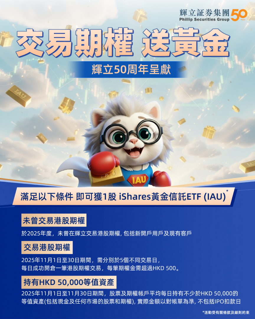 為慶祝輝立成立50週年,我們特別推出「交易期權 送黃金」活動!只需滿足以下簡單條件,即可免費獲得1股iShares黃金信託ETF (IAU),讓您的投資更添金彩。