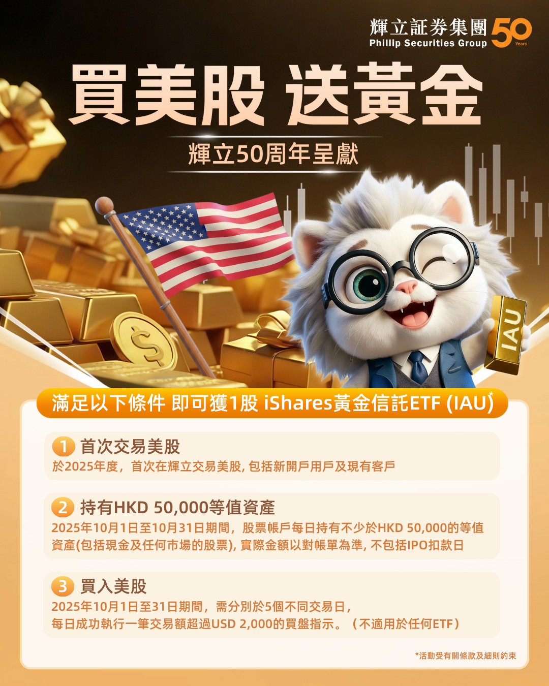 為慶祝輝立證券集團成立50週年,我們特別推出「買美股 送黃金」活動!只需滿足以下簡單條件,即可免費獲得1股iShares黃金信託ETF (IAU),讓您的投資更添金彩。