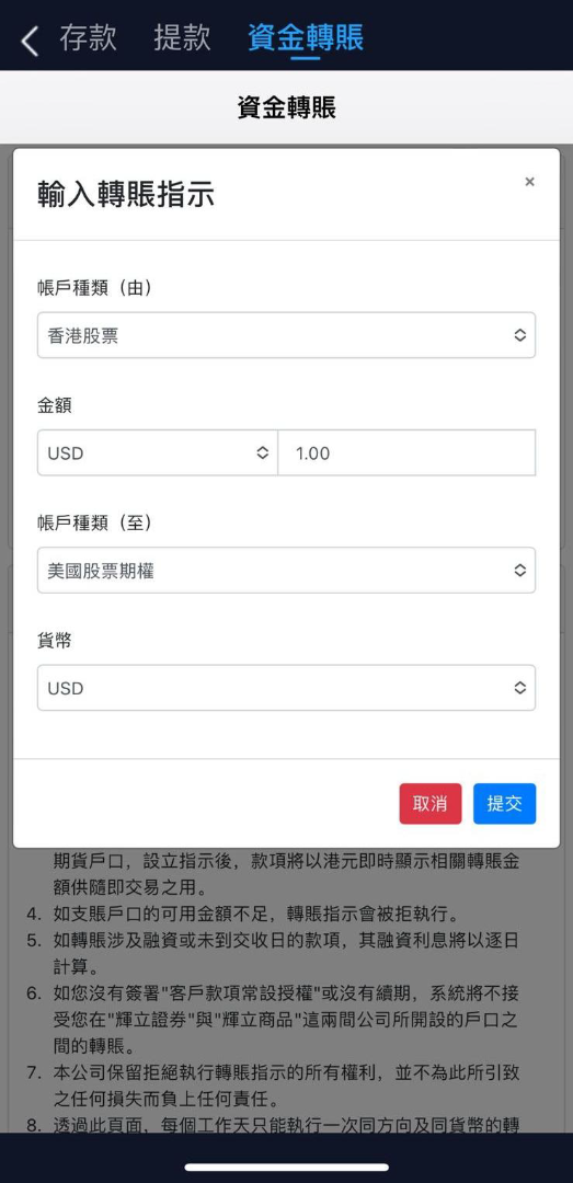 3. 頁面上方顯示現金餘額,下方顯示持倉。