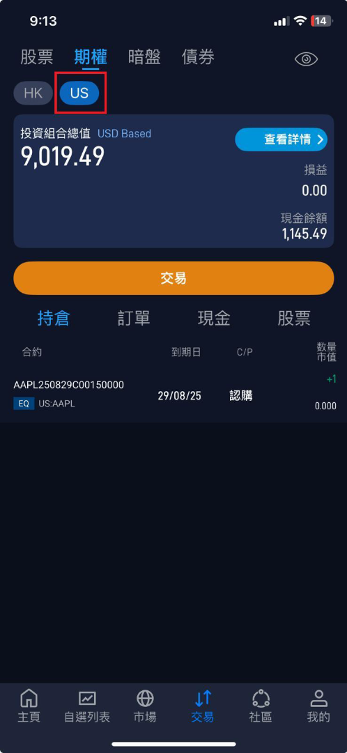 2. 點擊上方 期權 → 再選 US。